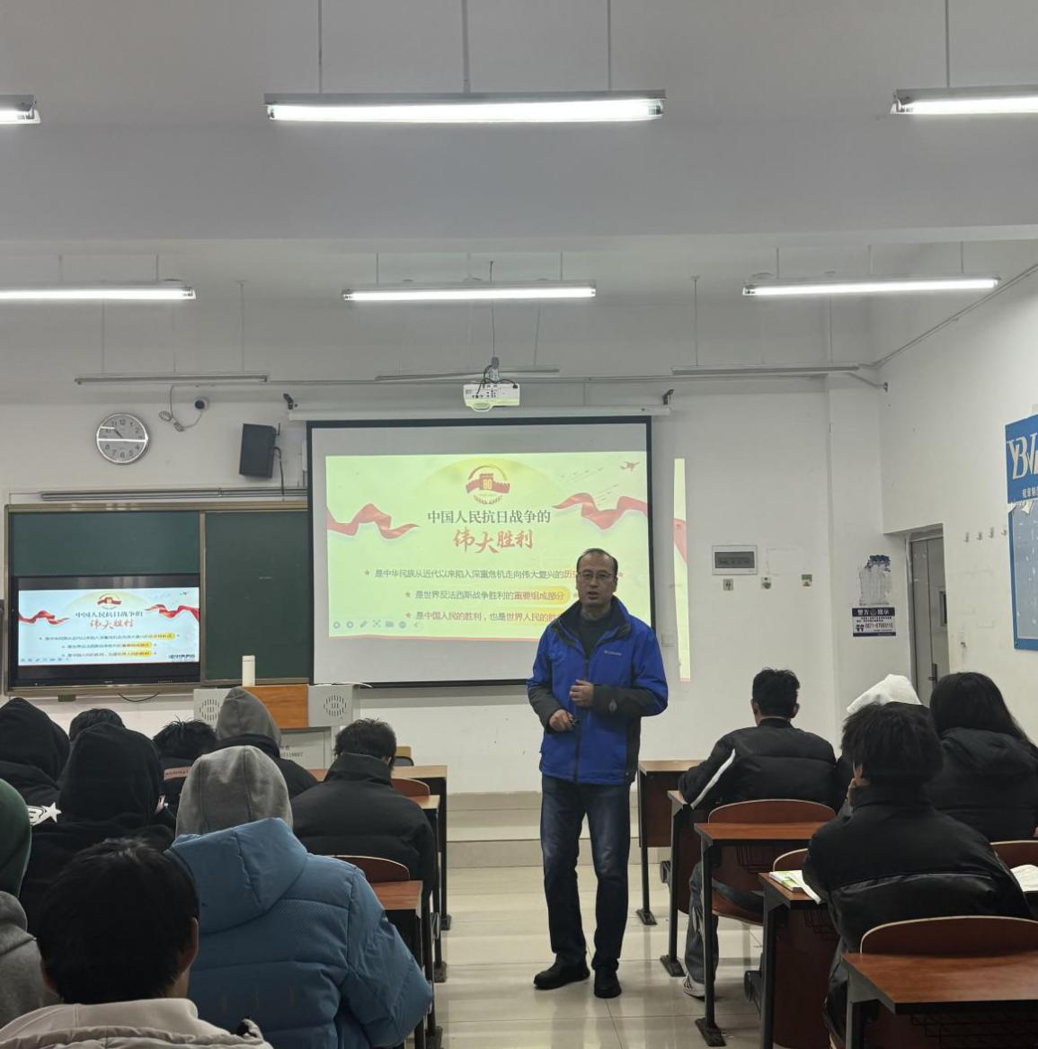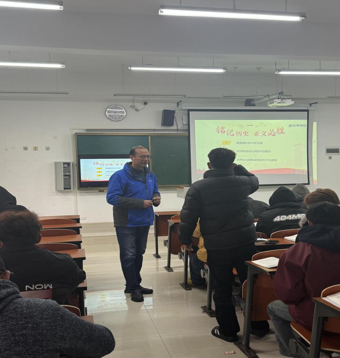 课堂上,张书记以“艰难曲折的14年抗战”、“全民族团结抗战的中流砥柱”、“世界反法西斯战争的东方主战场”三个方向为切入点,结合史料数据、战役地图和英雄事迹,带领同学们回顾历史,感受中国军民浴血奋战的壮阔历程,并结合生动的故事案例,重点阐释了中国共产党在建立抗日民族统一战线、提出持久战战略、开辟敌后战场等方面的中流砥柱作用,进一步深化爱国主义教育,引导学生铭记历史、砥砺担当。